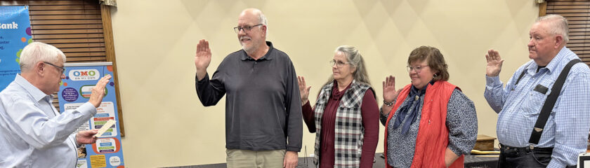 Bethany, MO: State Representative Mazzy Christensen was on hand to present a certificate to Harrison County’s State Fair Farm Family, Keith and Tabrey Kimbrough and son Kyler of Ridgeway. Another son, Kendall, could not attend.–Submitted photoBethany, MO: Incoming extension officers: Harrison County Presiding Commissioner Jack Hodge, left, swears in members of the County Extension Council at its annual meeting at the BTC Bank. They are, from the left, vice chairman Tom Fowler, Marcella Murray, chairman Teela Sadowsky, and treasurer Jerry Collins.–Republican-Clipper photo