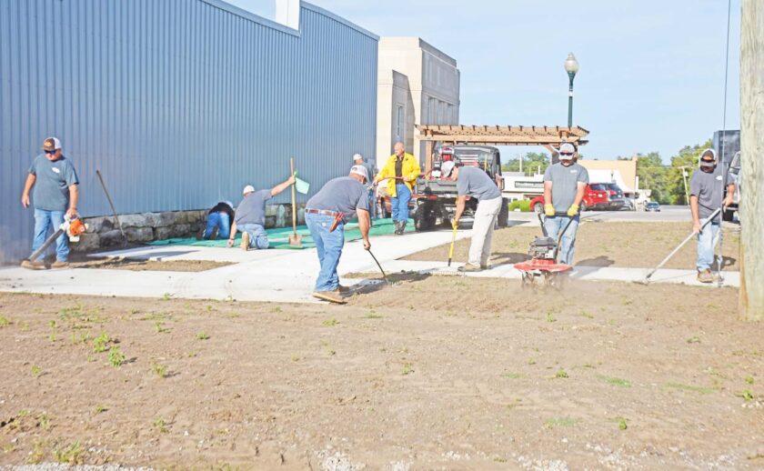 Bethany, MO: The street department in Bethany gathered at Central Park, located just off the square, to help prepare the park for grass. The land was tilted up and the earth overturned so the grass mats could be laid. City Administrator Jake Taylor pitched in to help cut the woven mats to size while Fire Chief Jacob Denum watered the newly planted grass.–Republican- Clipper photo