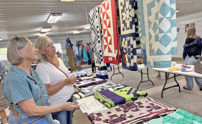 Deb McCampbell and Debbie Wimberly look over quilt projects .
