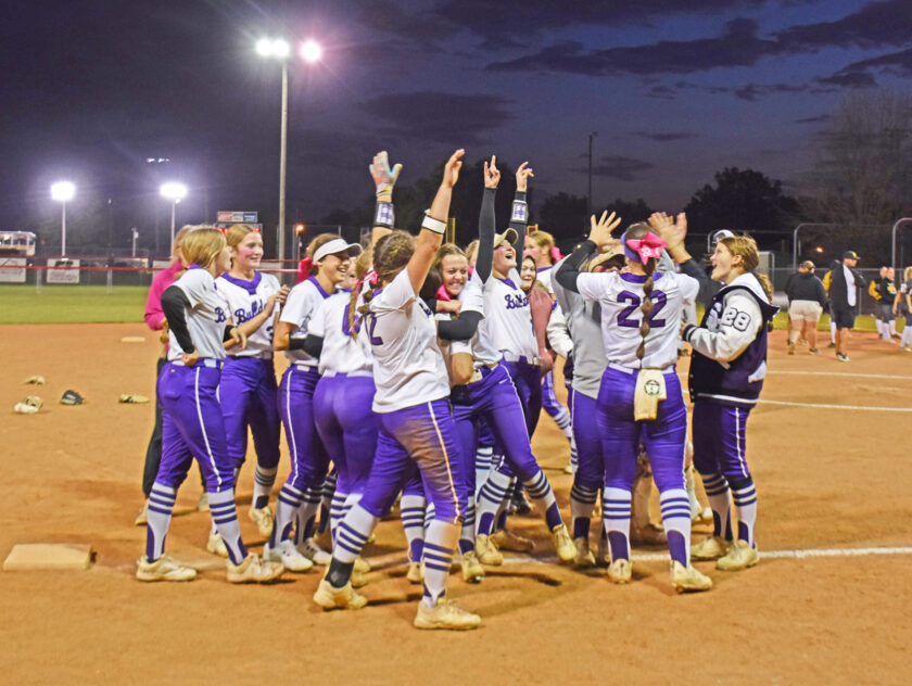 The South Harrison softball team celebrates their victory over the Tigers after beating Marceline 11-6 on Monday night. The Bulldogs become Distract 6 Champions and move on to face Highland in the Class 2 State Tournament on Saturday in Lewistown. In the Class 1 District 8 tournament, Albany defeated Gilman City 12-2 for the title.