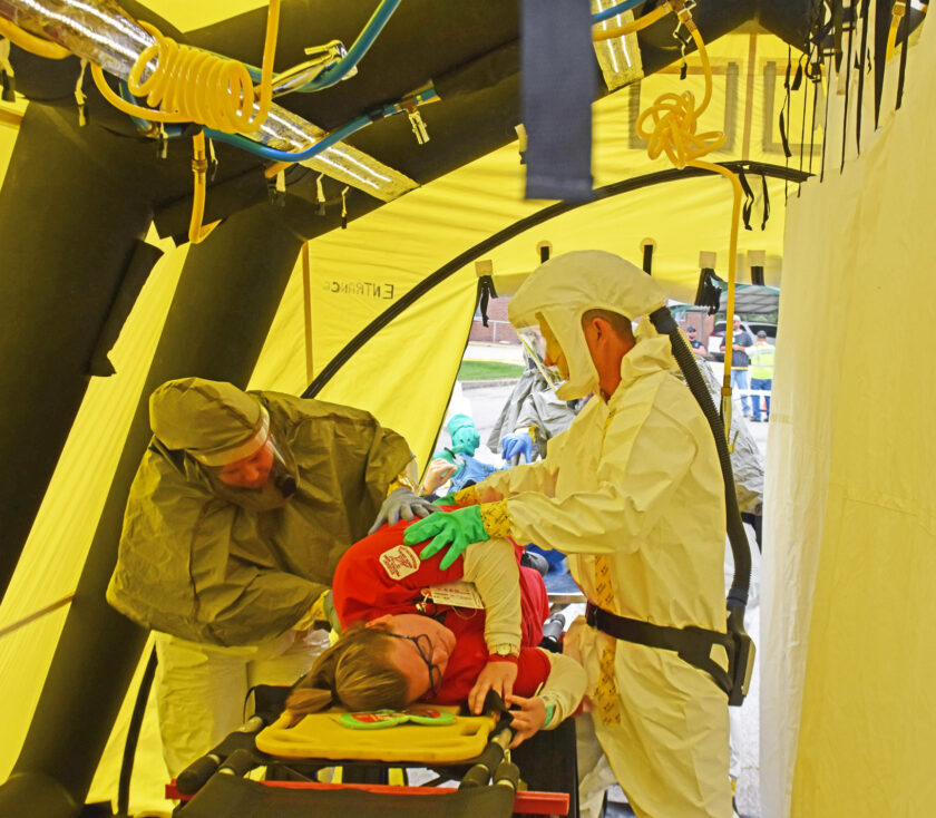 Inside the yellow tent HCCH staff cleans the “victims” of the fictional accident during a drill on October 14th. The drill was held to see if Harrison County could handle a wide spread emergency event.
