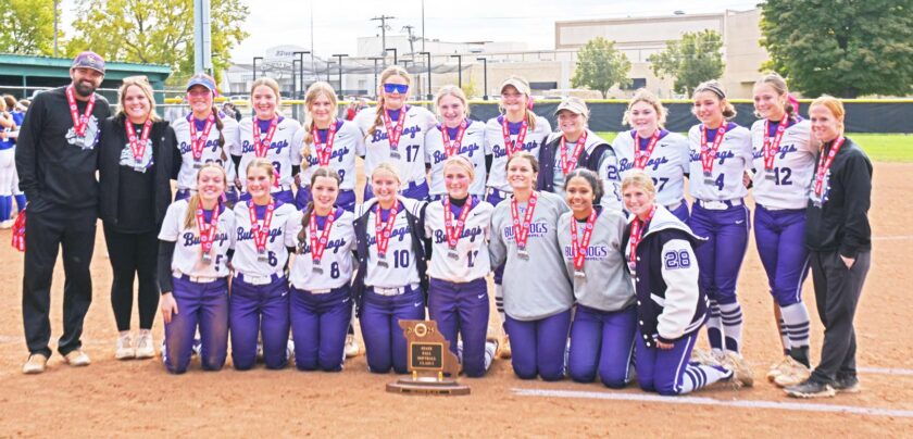 Bethany, MO: The South Harrison Lady Bulldog softball team completed a spectacular softball season, despite their 4-1 loss to the Holden Eagles in the state tournament Saturday in Springfield. The SHHS team entered the championship game after walloping Montgomery County 16-0 in the semifinal contest. The Lady Bulldogs are pictured with their second-place trophy alongside Coach Aaron Fitzpatrick and assistants Kaliska Madison and Chalsea Rector.–Republican-clipper photo, Caleb Osmon