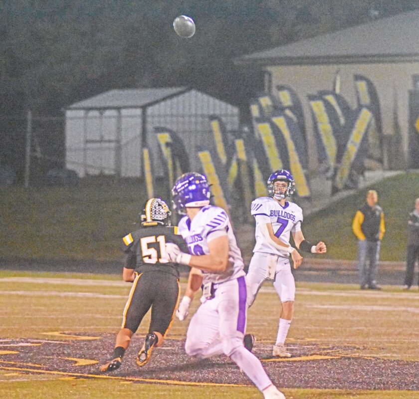 (Left) Jett Cornett sends a pass over the heads of the Dragons to Crae Coffey. Coffey caught the pass and moved the ball further down the field, but SH could not pick up any points during the game ending 46-0, and stopping the Dogs from advancing in the district tournament. (Right) Crae Coffey charges down the field with a pack of Dragons after him. He finished his career as a Bulldog after gaining more than 4,000 yards.