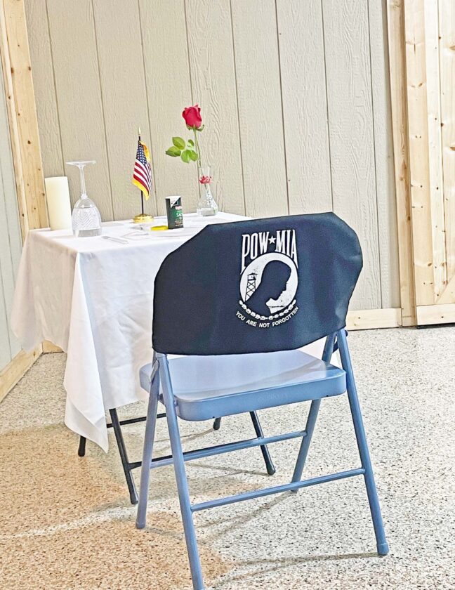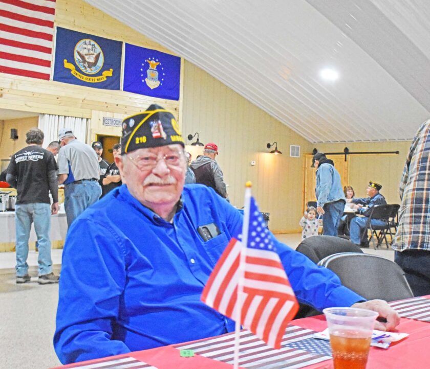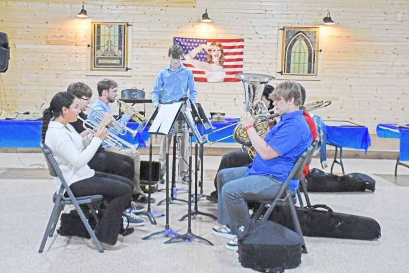 Former United States Navy man Dennis Miller talked about his time overseas, recalling his time serving on a carrier during the American Legion’s dinner on Veteran’s Day.Tucked in the corner of the hall, an empty chair was placed by a table along with a plate and a fork, the American Legion’s way of honoring the soldiers who didn’t make it back home.Some members of the South Harrison band, along with one of the band directors Mr. Aaron Morley, played the armed forces melody during the American Legion’s Veteran’s Day celebration.Republican-Clipper photos The American Legion’s Veteran’s Day celebration nearly packed the house. With the hall serving over a hundred people during the event, featuring soldiers of the past and present coming together to share stories and remember the fallen.