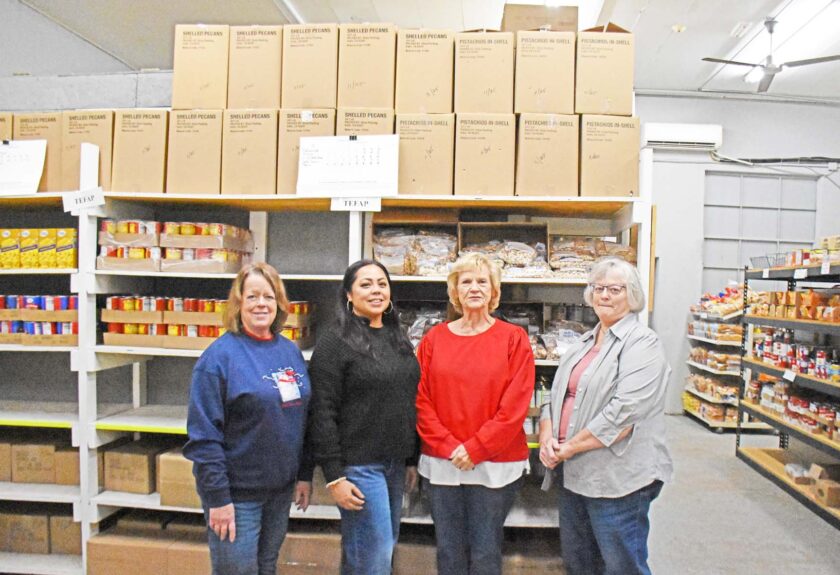 Debra Ware, office manager (left), Amy Deatherage, Agency Relations Coordinator, (center left) Debbie Nalle, Treasurer (center right), and Renee Terhune, Floor Manager (right) stand inside the food pantry. Moments earlier Deatherage, who works for Second Harvest, had just passed the pantry after her inspection.