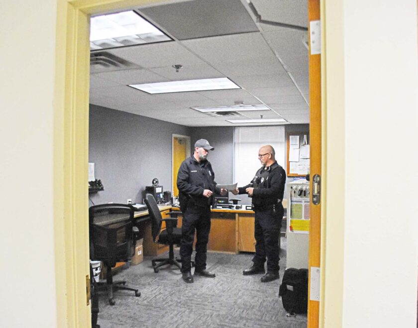 Officer Stallsworth (left photo) stands with Chief of Police Bryan Holloway (right) in the bullpen located inside the law enforcement center on the square. Earlier in the year the council started to make plans to build a police station somewhere in Bethany, allowing the policemen more space to operate in.
