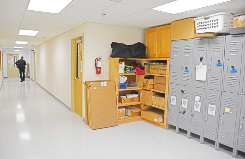 (Right photo) Two small rooms house the equipment needed to operate the six-man police unit in Bethany, the volume of police equipment that can’t fit inside the allotted space the law enforcement center provides, now sits at the end of a hallway.