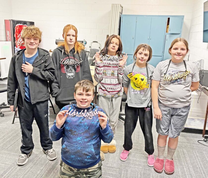 (Right) The six champion wordologists show off their “bling” during a word hunt at the Ridgeway R-V School. Left to right are Nick Polley, Isabella Taylor, Katelynn Polley, Kambrie Johnson, Bylee Booth, and Riley Alliet in front row.