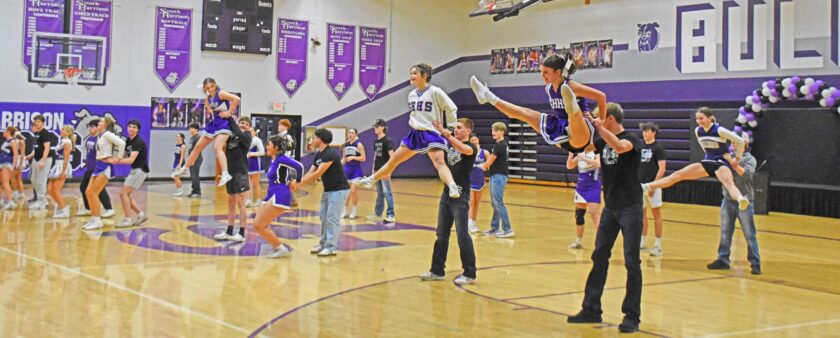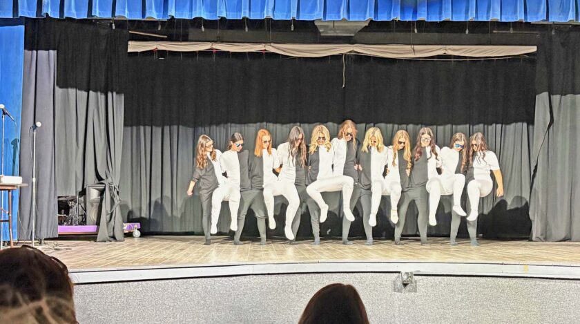 Left: The SH dance team played tricks on your eyes during the show. The girls kept the crowd guessing as to who was really moving. Center: Most of the acts were called back to the stage after Liam Sims (center) closed out the show, the students took a bow while still in costume. Right: The Cheerleaders get new dance partners during the pep rally when the basketball and wrestling team join them on the court.
