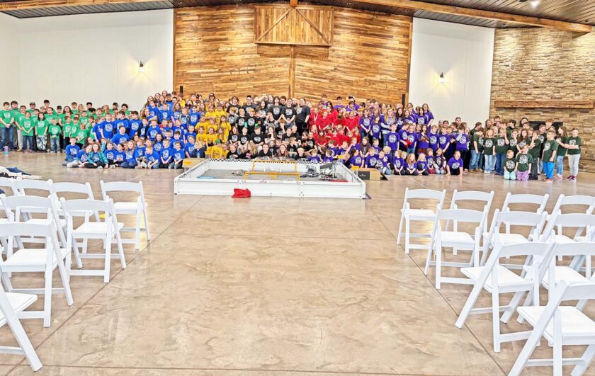 Bethany, MO: As the event comes to a close all of the students gather for a picture to mark the end of another STEM event in Bethany. This year 342 students joined in on the fun showcasing their creations highlighting what they had learned during their builds.–Republican-Clipper photo