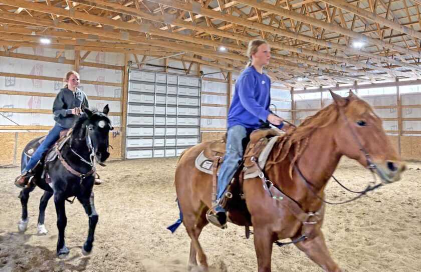 Bethany, MO: The Horsemanship Clinic, held over the weekend in the Bethany area, was moved to another venue just outside of town at the Shields’ family residence for fear of possible rain. The event taught riders what to expect during competition and what the judges would look for during the showing. The organization’s ultimate goal is focusing on helping children discover the sport. Pictured here are Oakley Hannah (far left) and her sister Hurley Hannah (right) who rode their horses around the barn at a steady pace.–Republican-Clipper photo